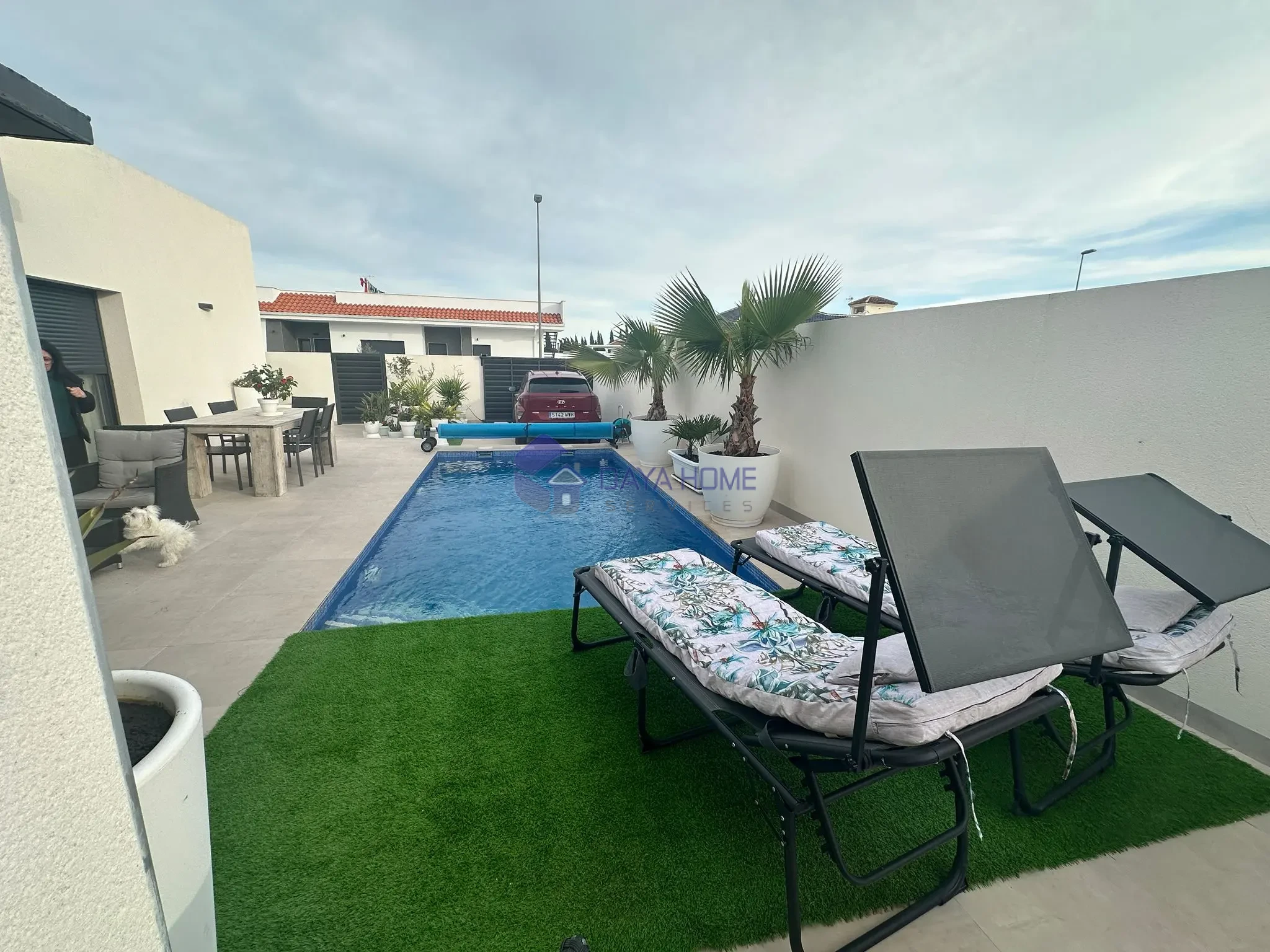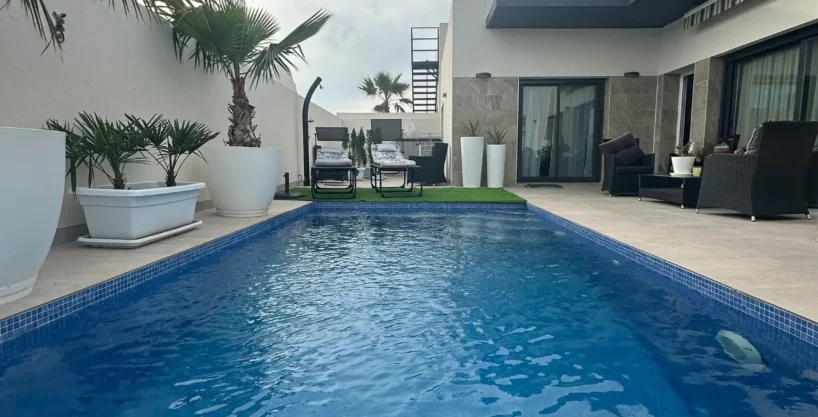 En el exterior, destaca su piscina privada de 6×3 metros con agua climatizada, perfecta para disfrutar durante todo el año, junto a una agradable zona exterior con toldo, ideal para crear un espacio de relax o comedor al aire libre.